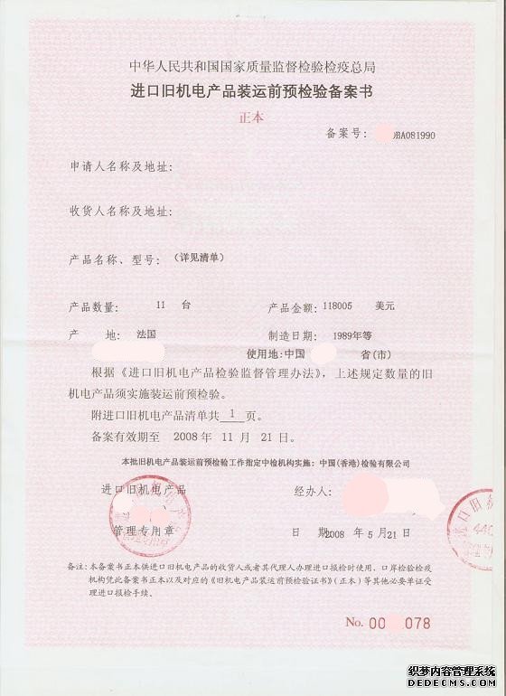 2. 国外供应商发货前,在进口港所在地商检局申请进口《旧机电商检预备案书》(7~15个工作日);